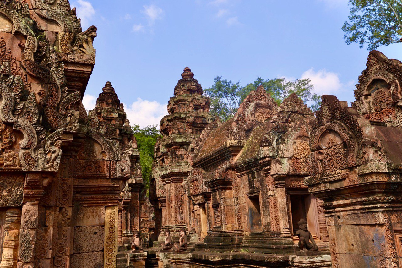 Banteay Srei ( the Lady Temple, the unique pinkish sandstone and the most beautifully detailed motives of Khmer Art and the first French-restored temple using the method of Anastylosis after the Frenchman named Henry Marshal studied this technique from the Dutch who undertook to reconstruct Borobudor in Java).